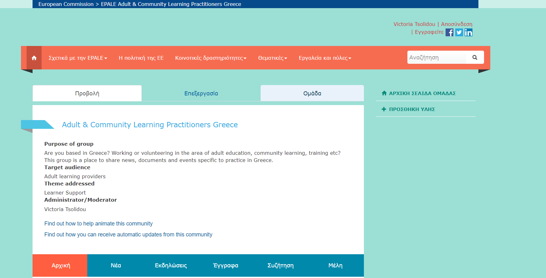 Ονειρευόμαστε την εκπαίδευση ενηλίκων στην Ελλάδα σε άλλα επίπεδα, εφάμιλλη με αυτή της Ευρώπης.Γι αυτό το λόγο, αποφασίσαμε να δημιουργήσουμε σε συνεργασία με την EPALE τη πρώτη κοινότητα για την Ελλάδα. Η EPALE είναι μια νέα πολύγλωσση κοινότητα όσων δραστηριοποιούνται στον τομέα της μάθησης ενηλίκων. Στόχος της είναι να βελτιωθεί η ποιότητα και η προσφορά στον τομέα της μάθησης ενηλίκων στην Ευρώπη, να εδραιωθεί με ισχυρά θεμέλια ο συγκεκριμένος τομέας σε πανευρωπαϊκό επίπεδο και να δοθεί η δυνατότητα σε όσους δραστηριοποιούνται στην εκπαίδευση ενηλίκων και στους φορείς με πολλαπλασιαστικό αποτέλεσμα να απευθυνθούν σε όλους τους ενήλικες.
